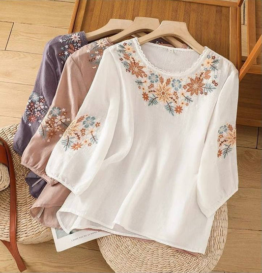Blush Pink Soft Cotton Top with Delicate Floral Embroidery
